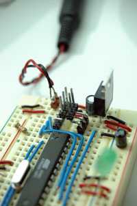 NOTE: there are 3 mistakes in the schematic: pin 1 and 2 of the 7404 (IC1) must be swapped / S1 (the reset switch) is connected between GND and pin 1 of IC2 (the atmega8) / pin 5 of X1 (serial connector) is connected to ground.