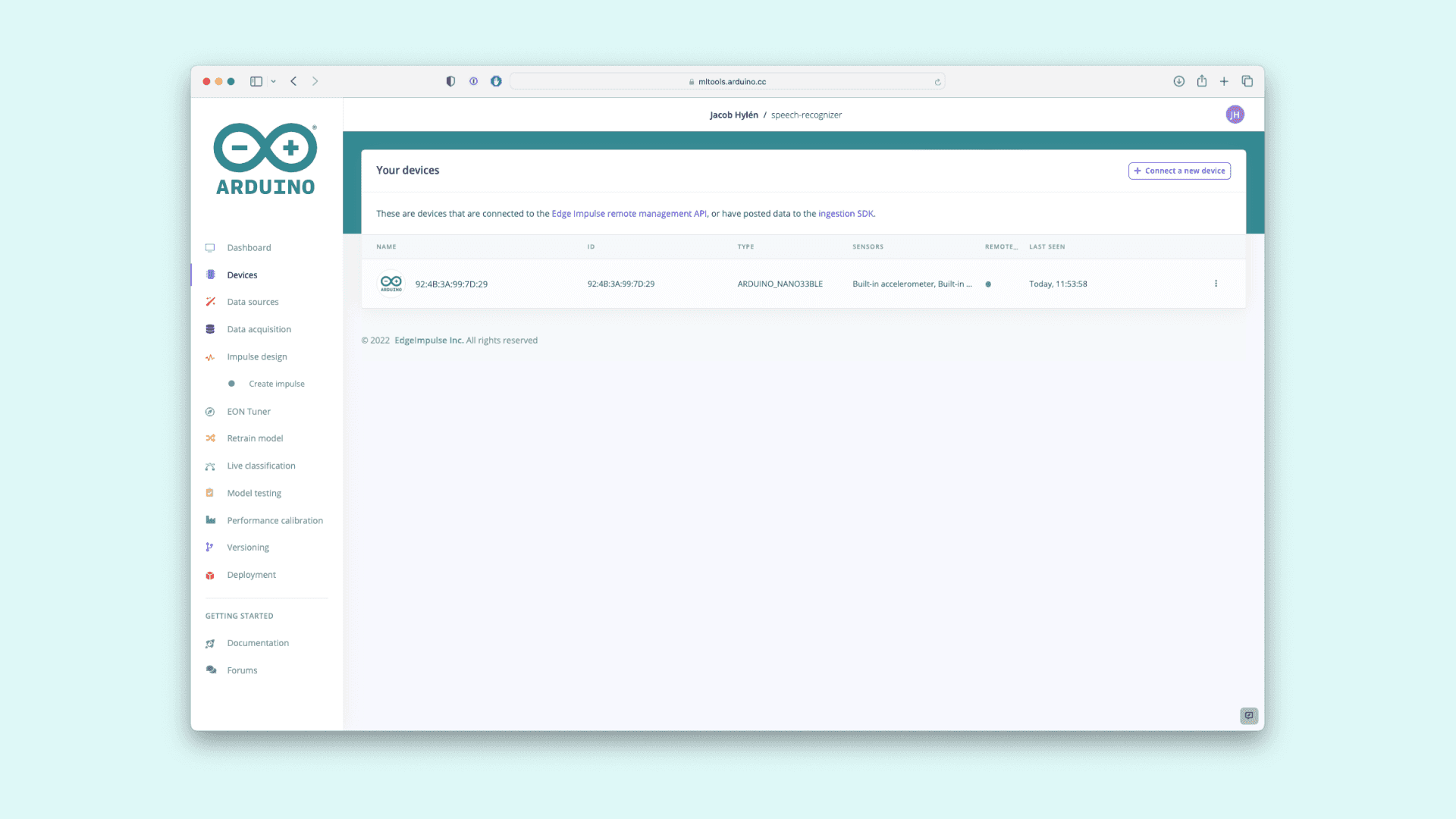 Now, in your Edge Impulse account, navigate to Devices on the left menu. You should see now your Nano 33 BLE Sense board name with its ID. A green dot should also appear if the board is connected to Edge Impulse correctly.