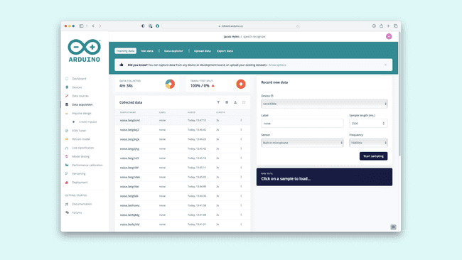 Also, in complete silence and without saying anything, record 50 more samples with the label noise. This samples are going to help the ML model identify when no keywords are being spoken. In total, you should get around 8 minutes of collected data with 4 different labels.