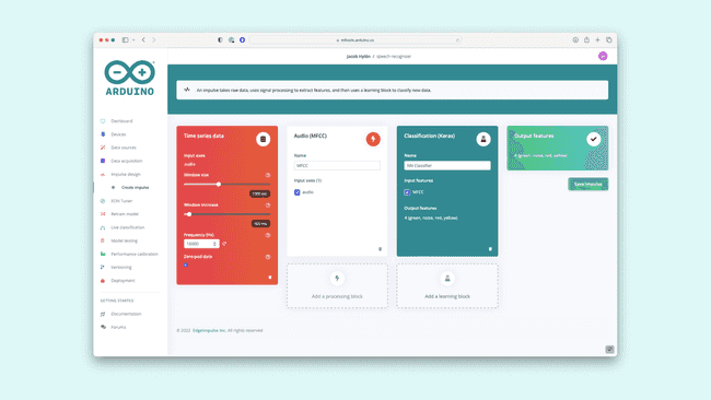 Now that we have all the data samples, it's time to design an impulse. An impulse, in a nutshell, is how your ML model is being trained, is where you define the actions that are going to be performed on your input data to make them better suited for ML and a learning block that defines the algorithm for the data classification. Navigate to Impulse design on the left menu and then select Add a processing block and add Audio (MFCC), then select Add learning block and add Classification (Keras). Keep all of the settings at their defaults for each block. Click on the Save impulse button.