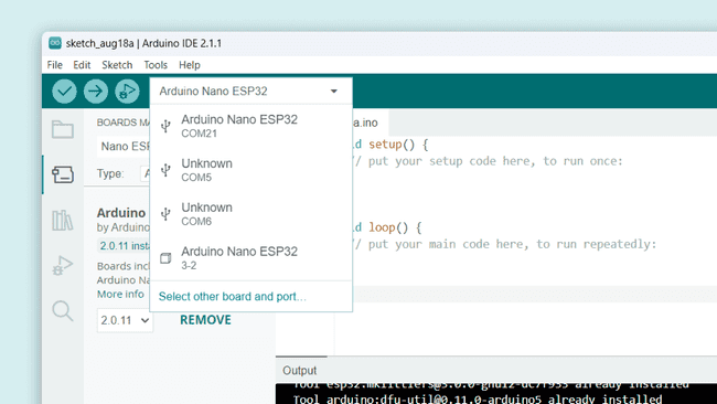 Note: You may see two versions for the Nano ESP32 available to pick in the board selector, one USB(COM21 in picture) and DFU(3-2 in picture). If you do, select the one with USB.