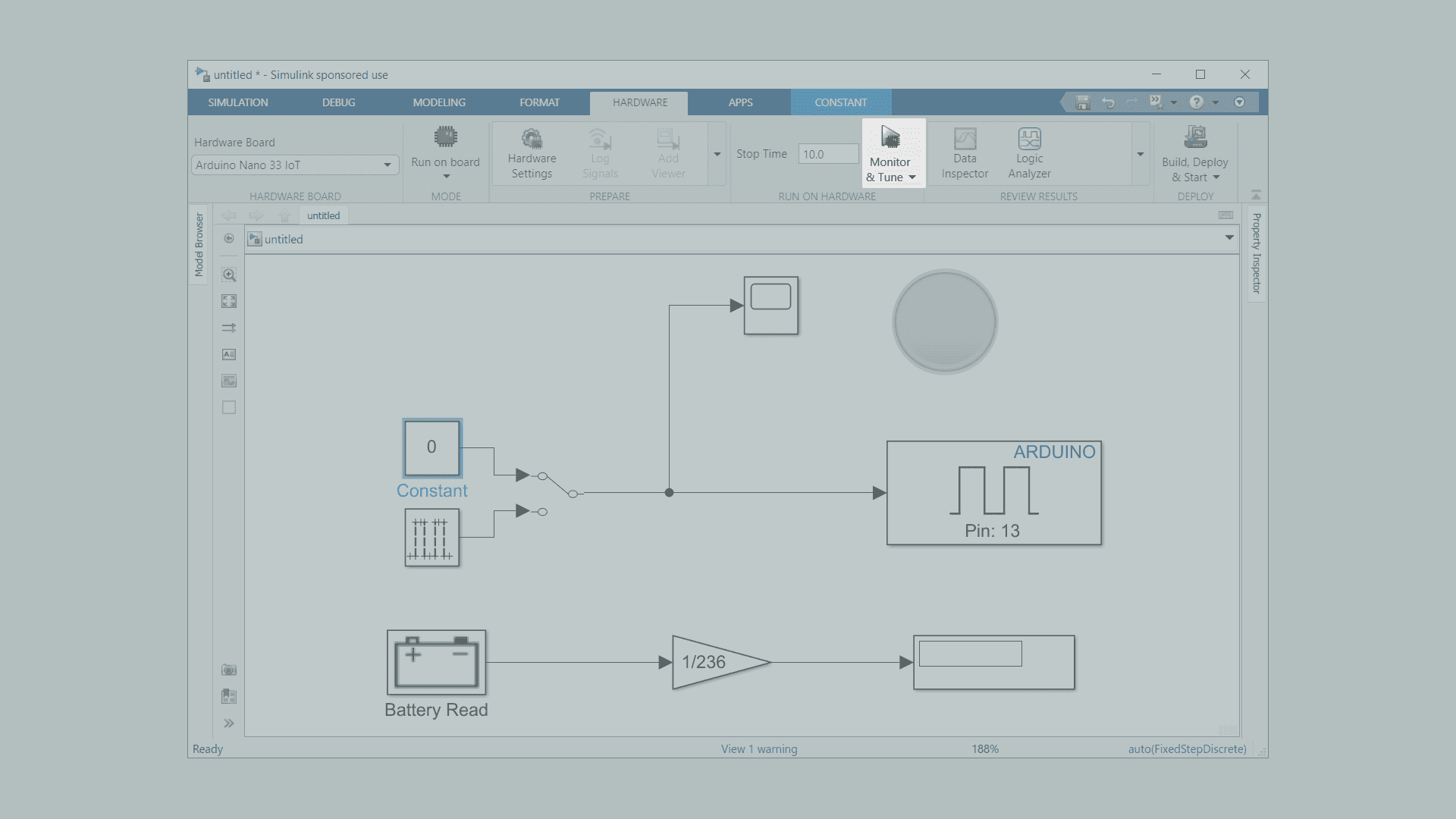 double then click on OK.7. Go to the Hardware ribbon. Make sure that the Mode is set to Run on board and that the Stop Time is set to 10. Click on Monitor and Tune. You should see the value on the Display block correspond to the voltage of the battery.