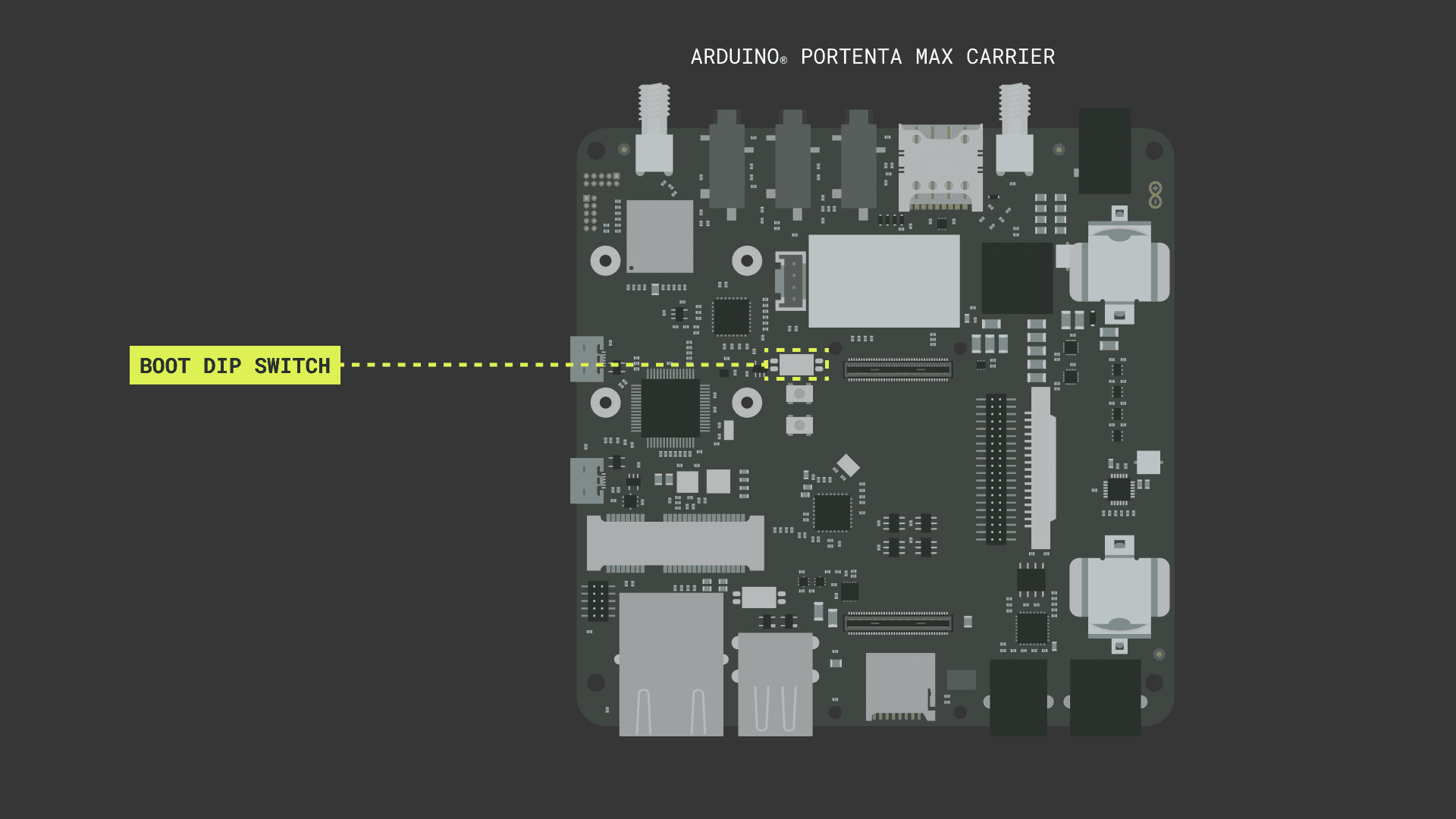 • Check the position of the BOOT DIP switch of the Portenta Max Carrier. If the Portenta H7 gets into bootloader mode immediately after power-on, including when connected via USB-C®, change the position of the BOOT DIP switch to OFF.